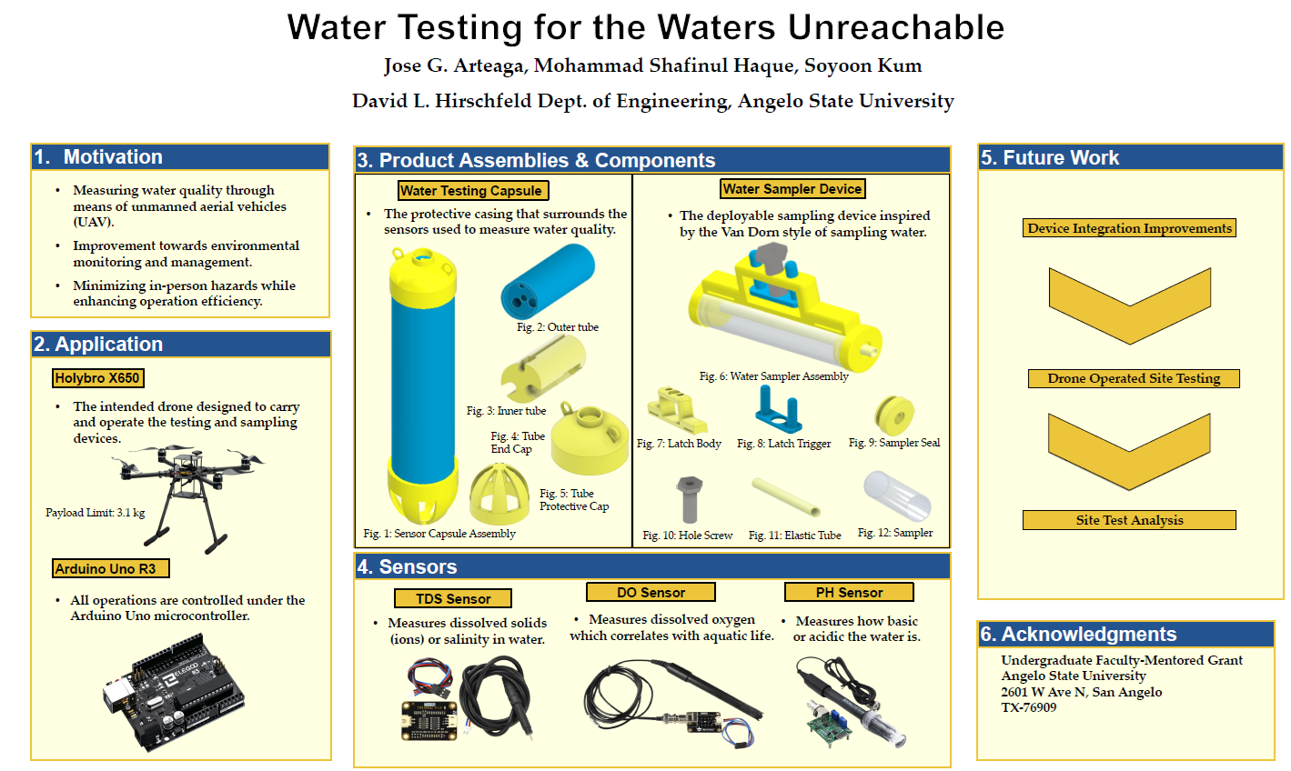 Abstract: This study proposes the development of an on-site water sampling and quality measurement device designed for integration with an unmanned aerial vehicle (UAV). The primary objectives of this device are to measure critical water quality parameters, including pH levels, dissolved oxygen concentration, and total dissolved solids, as well as to collect water samples for subsequent laboratory analysis. The innovative design aims to enhance operational efficiency and accessibility while minimizing potential hazards associated with in-person sampling. By utilizing a partnered research drone, this device seeks to streamline water quality assessment processes in diverse environments, thereby contributing to improved environmental monitoring and management practices.